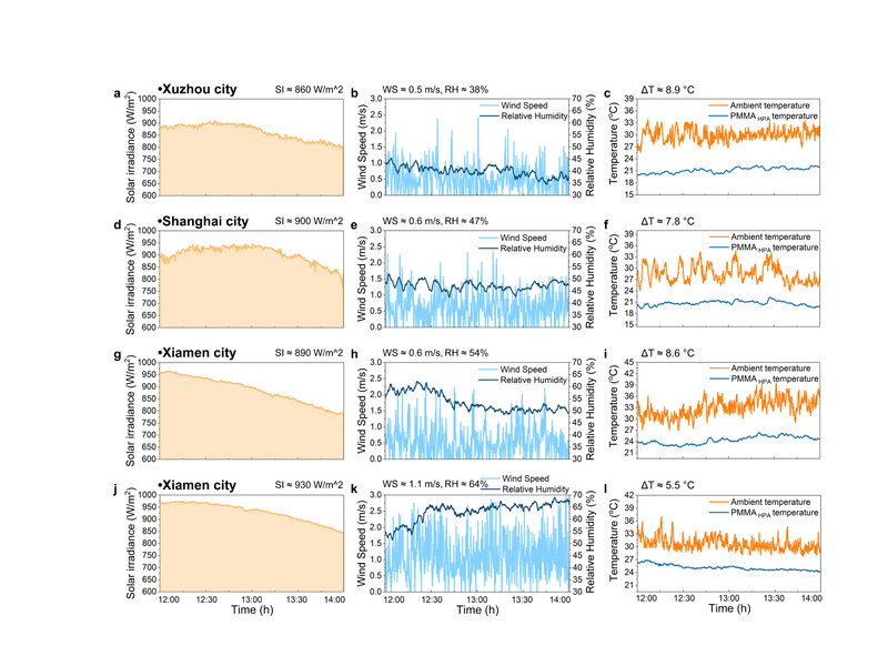 图4.(a-i)PMMAHPA薄膜在不同地点和天气下的日间被动辐射冷却性能对比。