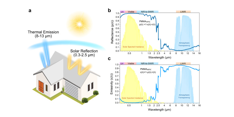 图2.(a)该材料用于建筑物屋顶时的降温原理示意图,(b-c)PMMAHPA薄膜的光反射和光发射效率。