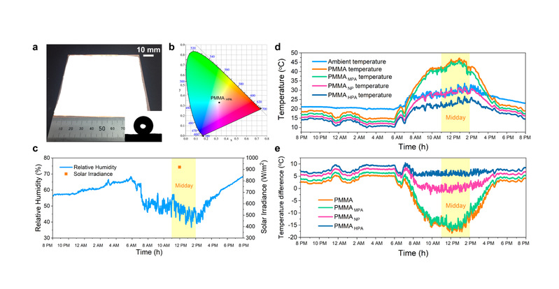 图3.(a)PMMAHPA薄膜的外观照片和水接触角,(b)PMMAHPA薄膜的色度坐标,(c-e)四种不同结构聚合物薄膜的全天被动辐射冷却性能对比。