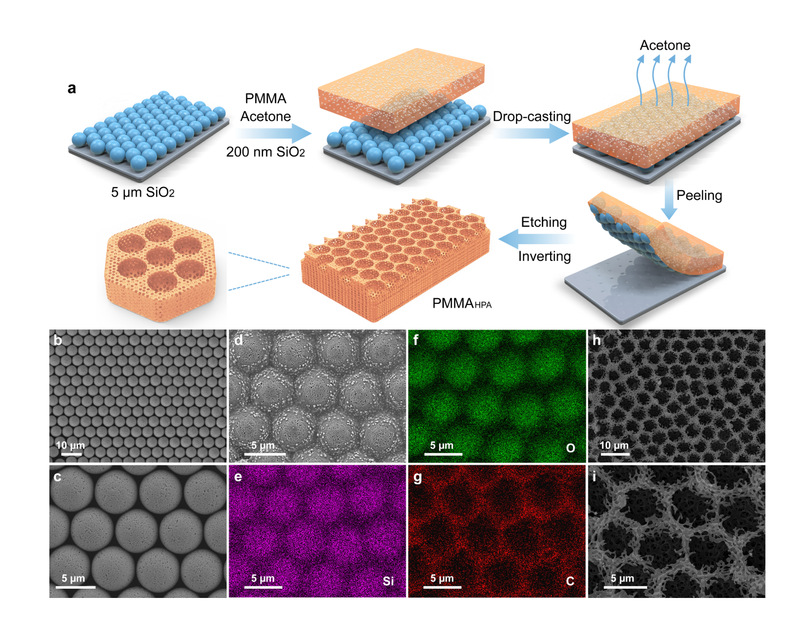 图1.(a)PMMAHPA薄膜的制备过程示意图,(b-c)SiO2阵列模板的扫描显微图像,(d-g)PMMA/SiO2复合薄膜的扫描显微图像和元素分布图,(h-i)PMMAHPA薄膜的扫描显微图像。