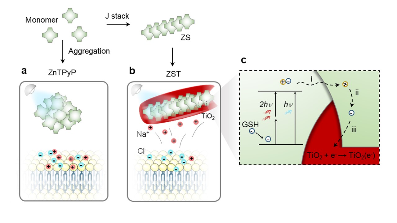 图1. J-ZnTPyP@TiO2纳米光电极的设计示意图和工作原理图