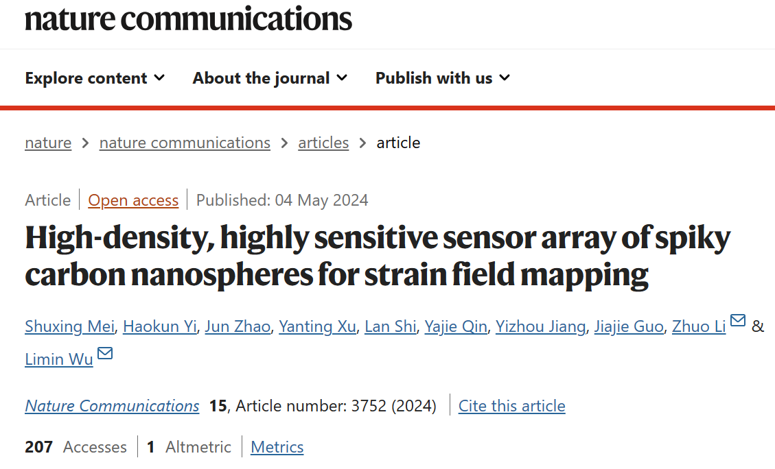 腐漫画 武利民团队在前期发现并构筑了具有Fowler-Nordheim (F-N) 量子隧穿效应、可大面积旋涂的高透明柔性压力传感器(Nature Communications, 2020, 11, 3529;Advanced Materials, 2023, 35, 2210091)的基础上,进一步将F-N隧穿效应作为一种新机制引入到应变传感领域;提出了一种基于密堆积、粒径单分散的带刺纳米碳球的柔性应变传感薄膜。纳米球间的F-N隧穿效应使得传感器在0~60% 应变范围内具有超高的灵敏度(最高可达70000)和超过99% 的对数线性。进一步,作者还将密堆积的纳米碳球图案化形成超高传感密度(100 pixel cm-2)应变传感阵列。而其粒径的单分散性和密堆积结构也确保了阵列单元间的高度一致性(标准偏差 ≤ 3.82%),为应变场的高分辨率原位测量提供了一种直接而简便的方法,有望在生物力学、结构健康监测和软机器人等领域获得应用。该研究近日以题为“High-density, highly sensitive sensor array of spiky carbon nanospheres for strain field mapping”的研究论文发表在《Nature Communications》上。腐漫画 武利民教授、李卓青年研究员为通讯作者,博士后梅述钘和直博生易浩琨为论文共同第一作者。腐漫画 信息学院秦亚杰教授团队和华中科技大学郭家杰教授团队也参与了该项研究。