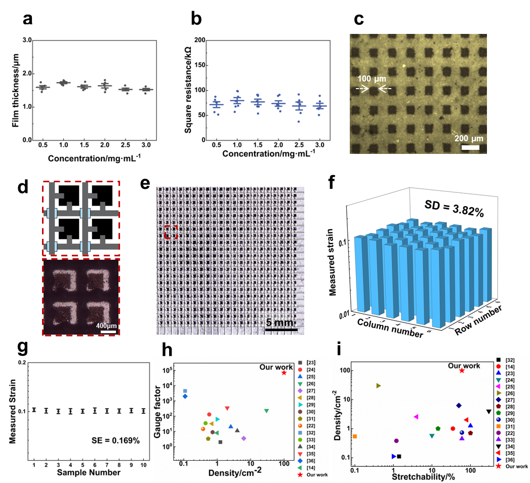 除了每个传感单元优异的传感特性,整个柔性应变传感阵列薄膜可以共形贴附在不同形状表面,以准确获知被测物体的应变分布。而且该阵列薄膜还具有超高的传感密度(100 pixel cm-2),以及优异的阵列单元间一致性(标准偏差≤3.82%)。其传感密度明显高于已报道的柔性应变传感阵列。
