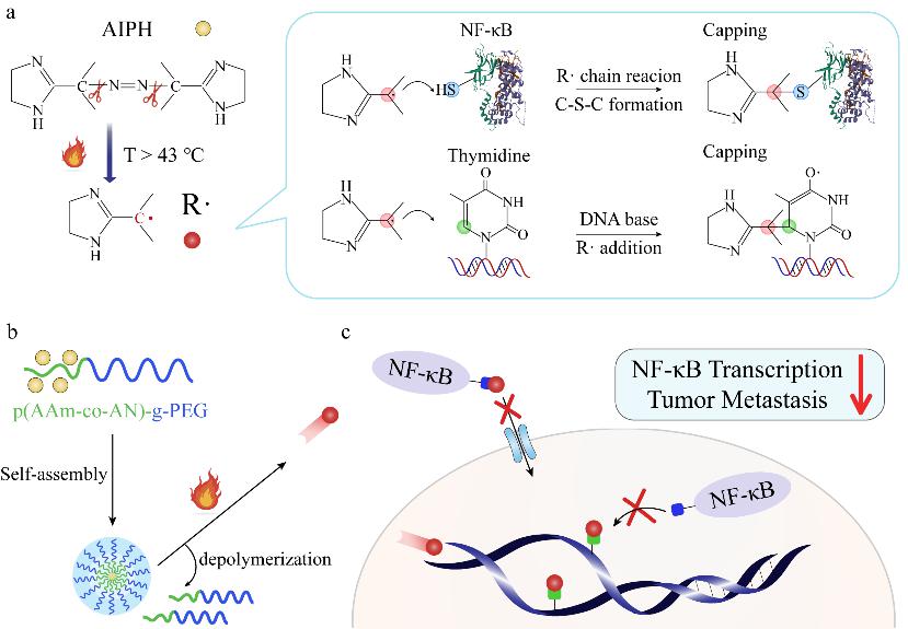 近日,腐漫画 /聚合物分子工程国家重点实验室步文博教授、澳大利亚悉尼科技大学/宁波东方理工大学(筹)金大勇院士和腐漫画 附属肿瘤医院何新红主任医师的合作团队,受启发于高分子化学经典的封端反应,首次提出了自由基封端转录因子的抗肿瘤新策略,巧妙利用逆向思维,通过自由基生化反应封闭转录因子活性位点,创新性实现了肿瘤细胞内转录因子NF-κB的高效抑制(图1)。该工作构建了装载碳自由基前体分子(AIPH)的热敏纳米胶束,经癌细胞内吞和低热处理(43°C)后,可快速在癌细胞内解组装并释放AIPH,通过持续热分解生成碳自由基(R∙),完成癌细胞内R∙精准递送。该研究创新性揭示了碳自由基的生化反应新机制:R∙可以通过自由基亲电加成反应与核酸碱基的双键结合,还可以通过自由基链式反应与NF-κB中的巯基结合形成C-S键(图2)。通过封端这两个关键位点,可同时抑制NF-κB核转位和NF-κB-DNA结合,NF-κB转录总抑制率高达94.1%(图3)。