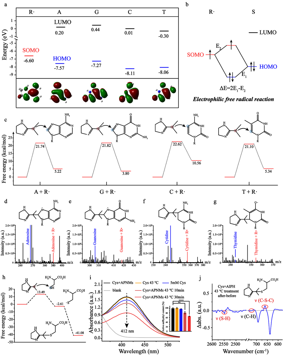图2. R∙通过亲电自由基加成与DNA碱基中的双键结合;R∙通过两步自由基链式反应与NF-κB活性巯基结合形成C-S-C键。