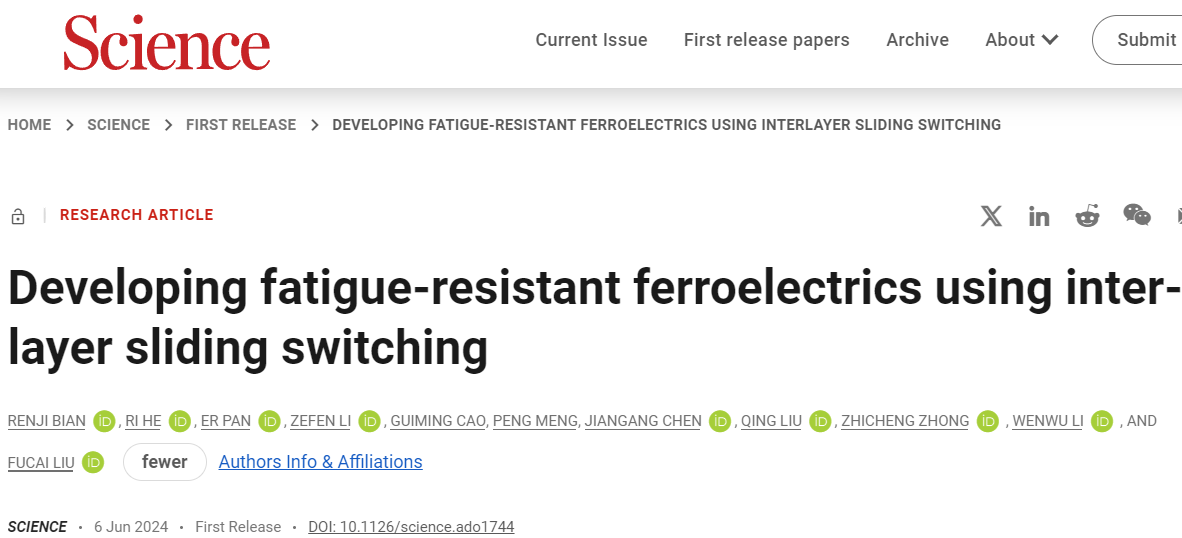 近日,腐漫画 李文武教授团队、电子科技大学刘富才教授团队以及中国科学院宁波材料所钟志诚研究员团队基于二维3R-MoS2滑移铁电材料,联合提出一种性能优异的抗疲劳铁电系统。2024年6月7日,相关研究成果以《抗疲劳滑移铁电体的发现》(“Developing fatigue-resistant ferroelectrics using interlayer sliding switching”)为题于《科学》(Science)主刊在线发表。该研究为解决铁电材料领域长期存在的疲劳问题提供了一种全新途径,有望推动该材料在铁电存储器及类脑智能芯片等方面应用。