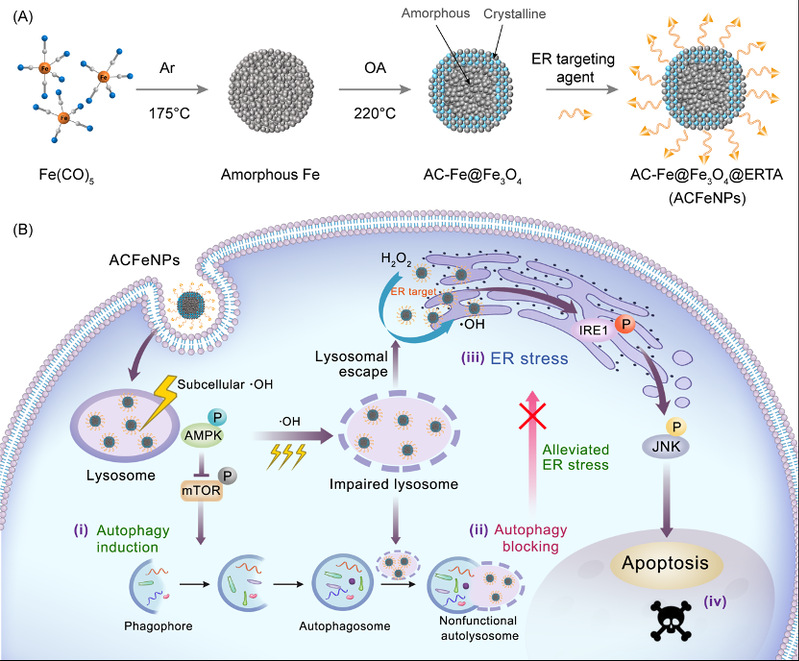 近日,腐漫画 /聚合物分子工程国家重点实验室步文博教授与腐漫画 基础医学院吴健教授、腐漫画 附属华山医院姚振威教授的合作团队,在国际核心学术期刊Advanced Materials 上发表研究论文,首次提出了细胞器时空通讯拦截的创新策略用于肿瘤化学动力学疗法(Chemodynamic Therapy,CDT),揭示了其治疗肿瘤的生物学新机制。研究人员设计合成了一种由高活性非晶Fe内核和化学稳定性晶化Fe3O4外壳层构成的Fe@Fe3O4纳米颗粒作为纳迷拦 截 器(ACFeNPs)。ACFeNPs的特殊核壳结构赋予其具备持续高效催化非均相Fenton反应的特性,产生的羟基自由基(•OH)及其作用位点与材料在细胞内的时空转运特性和轨迹精准吻合。ACFeNPs被癌细胞内吞后,首先进入酸性溶酶体腔室并催化过氧化氢(H2O2)产生羟基自由基,通过激活AMPK/mTOR信号通路而启动自噬系统;随后,羟基自由基利用其强氧化性损伤溶酶体,诱导肿瘤细胞内功能失调性自噬溶酶体的形成,进而阻断了自噬流;而逃逸出溶酶体的ACFeNPs可靶向内质网,通过催化生成羟基自由基,进而诱导内质网应激,由于溶酶体自噬流的预先阻断,导致大量积累有毒蛋白和受损内质网无法得到及时清除和修复,最终高效激活内质网应激相关IRE1/JNK凋亡信号通路诱导癌细胞死亡。该研究利用纳米材料在癌细胞内的时空转运特性,通过时空序惯性的方式高效阻断了溶酶体与内质网之间的通讯,从而在癌细胞和荷瘤鼠活体上实现了高效的肿瘤CDT治疗。