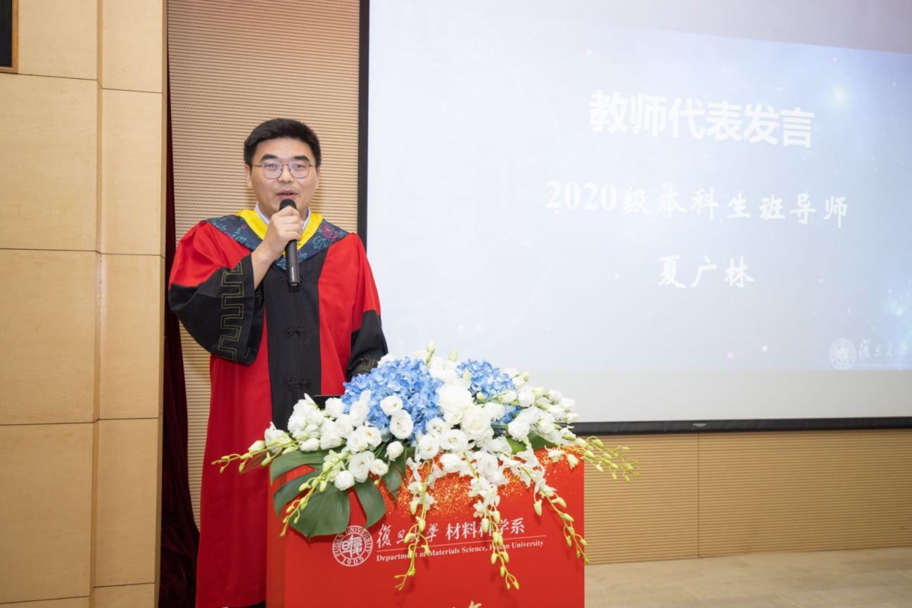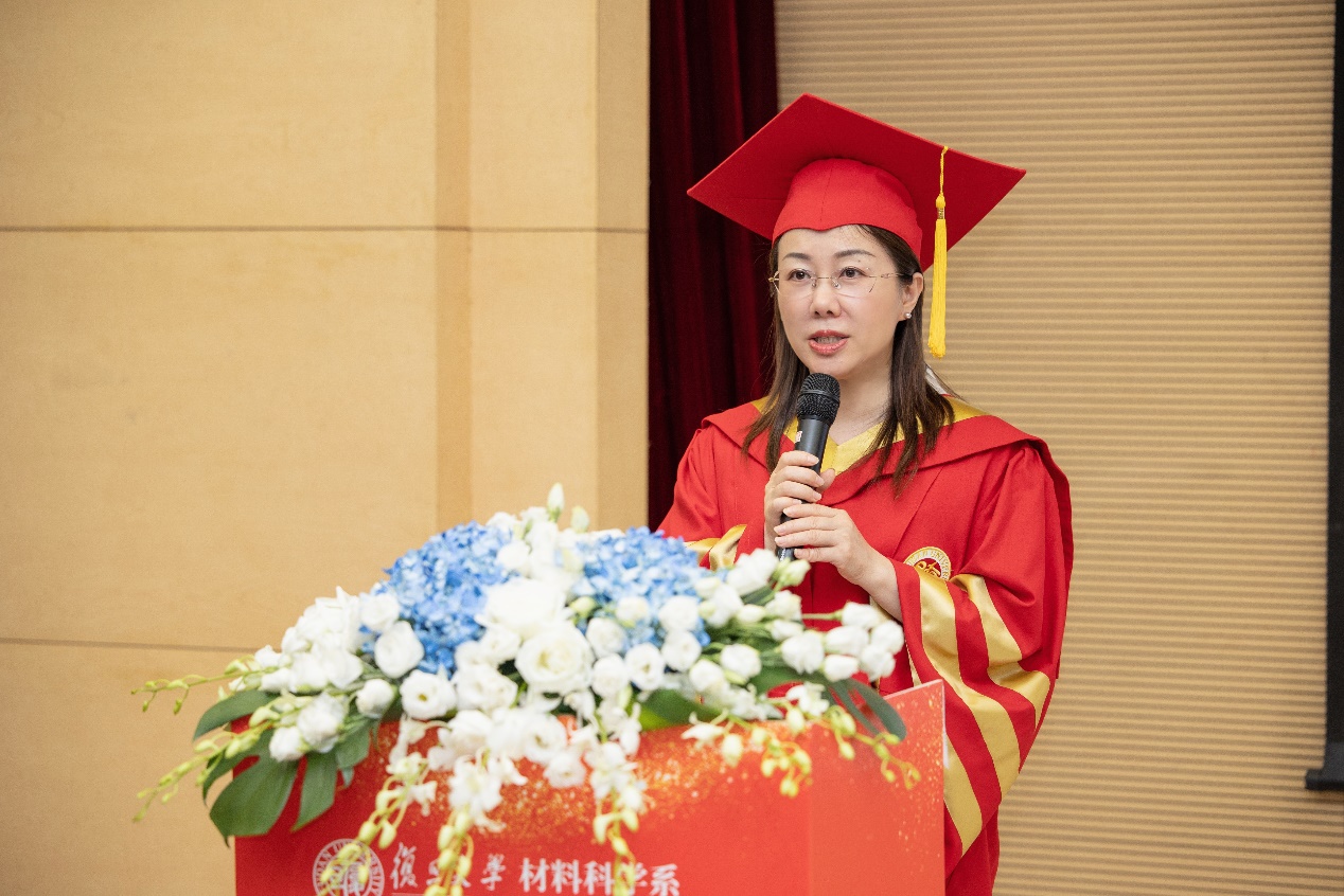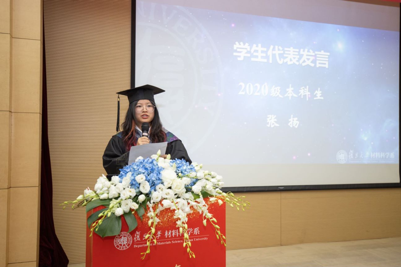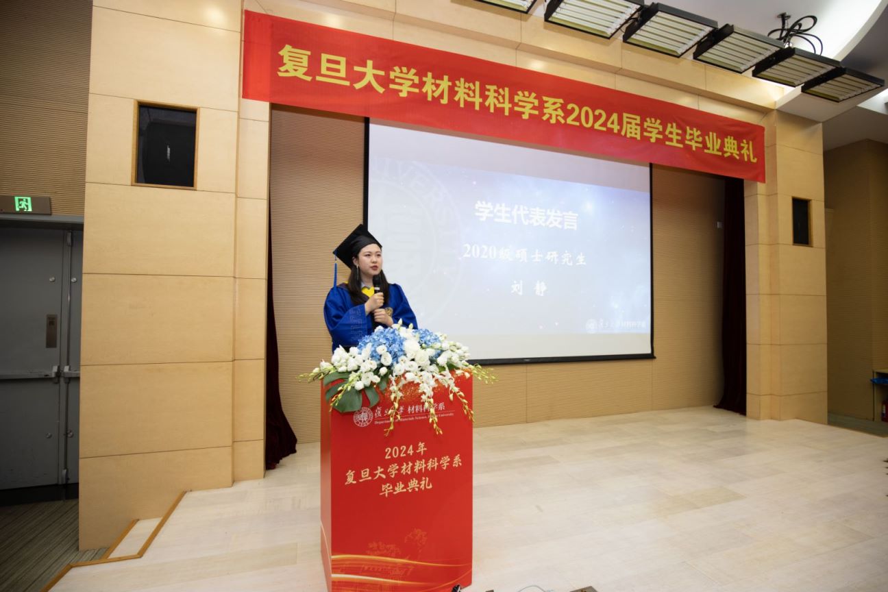 2020级本科生班辅导员刘静作为研究生毕业代表发言。她回顾了自己的学习科研经历,并分享了辅导员生涯的体悟和感恩,以表达对母校和母系最真诚的祝福。同时,她也期待和每一位毕业生一起,在国家各个重点行业和单位继续发光发热,写好属于复旦材料人的青春篇章。