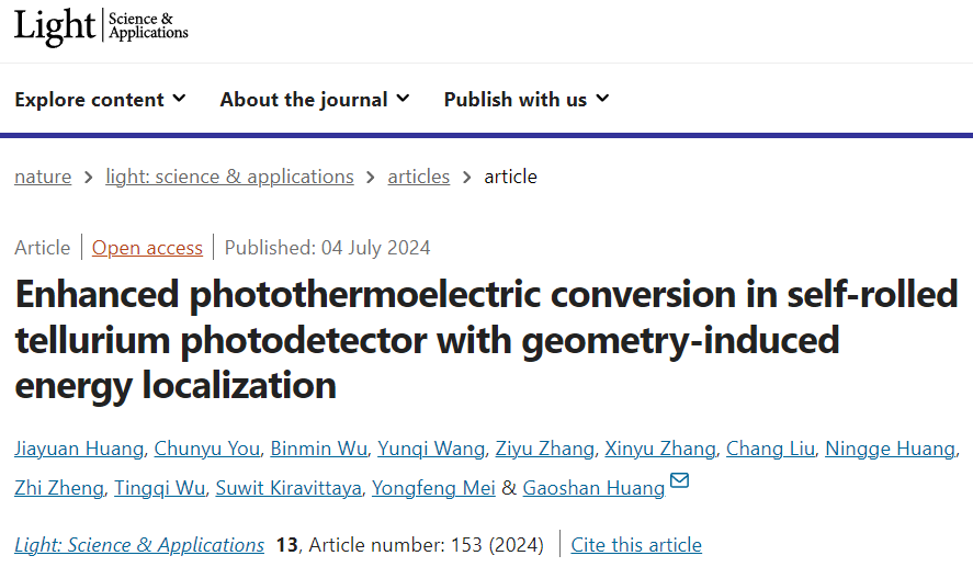 近日,腐漫画 黄高山/梅永丰课题组利用自卷曲技术,将作为光热电活性材料的碲纳米薄膜从衬底分离并组装成三维管状自驱动光探测器,揭示了器件中的光、热能量局域以及三维尺度下的光-热-电转换机制,实现了宽带光探测及灵敏度提升,为多维度光电探测提供了有效的解决方案。相关研究成果以“Enhanced photothermoelectric conversion in self-rolled tellurium photodetector with geometry-induced energy localization”为题,发表于Light: Science & Applications。