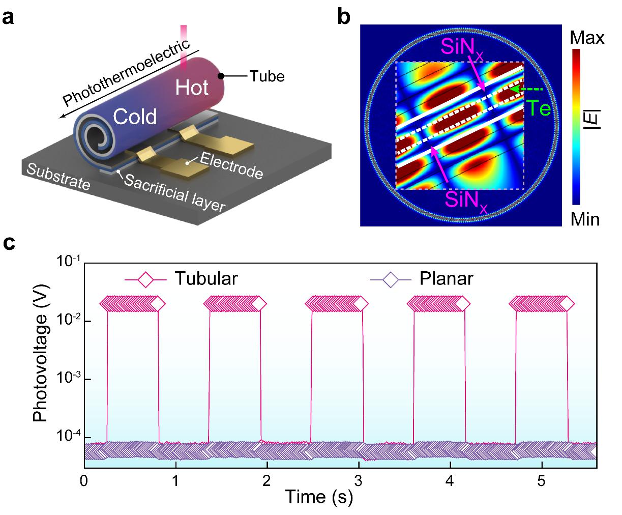 团队提出选用光热电活性材料,应用自卷曲纳米技术,利用纳米薄膜纵向内应变梯度,将从衬底释放的纳米薄膜组装成三维卷曲结构(图1a)。由于谐振效应,光场能量被局域在悬空的三维管壁中(图1b),产生更大的温度差,因此在热-电转换中产生了显著的电势差。实验结果进一步验证了管状探测器对光探测性能提升的显著效果,自驱动光生电压实现了307倍的提升。