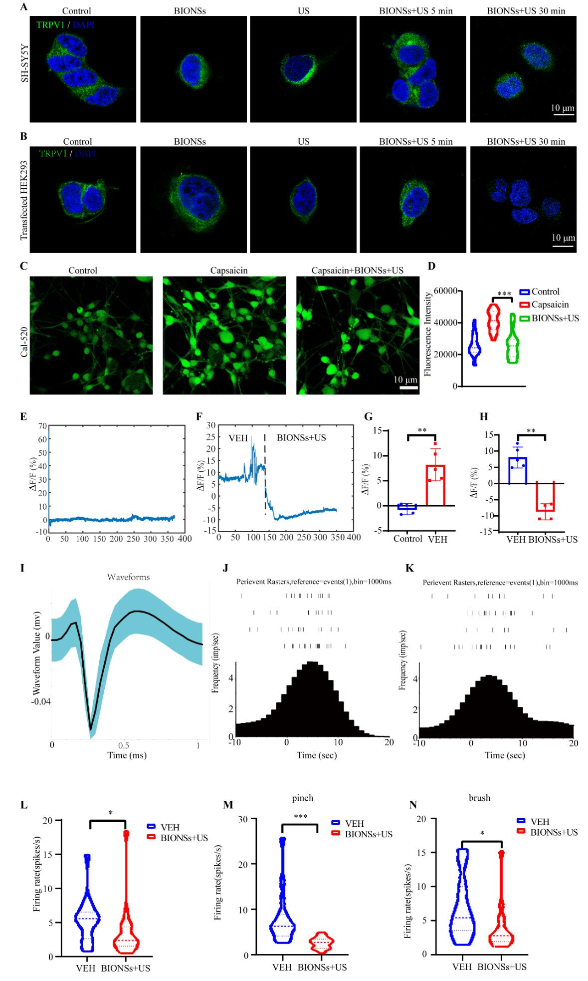 图3. 超声激活的压电极化场诱导TRPV1内化,从根本上抑制疼痛信号传导。