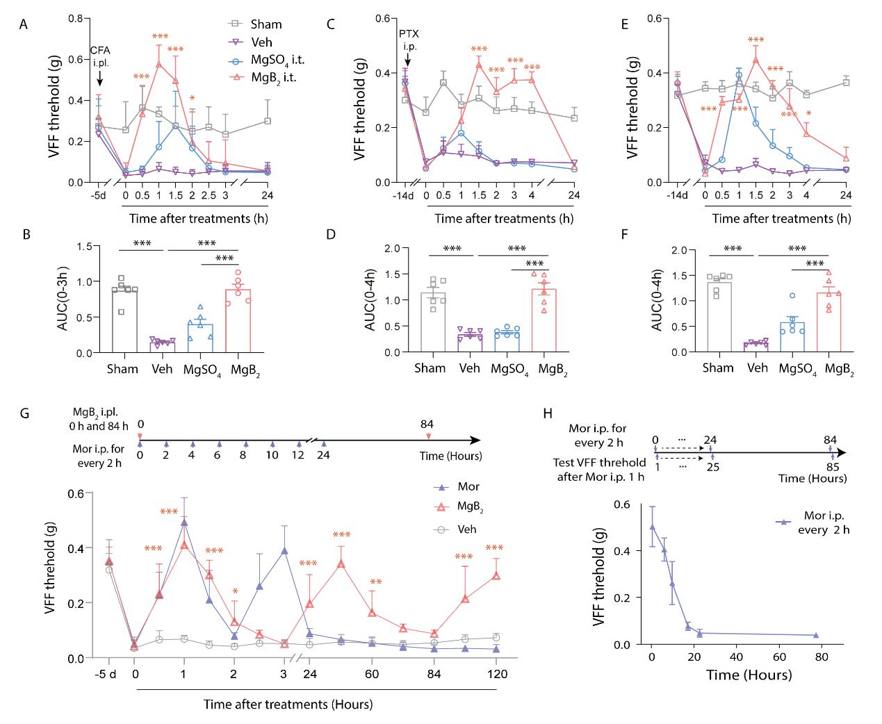 图2. 机械痛敏检测:MgB2可对多种疼痛模型强效止痛,效果优于吗啡,且无耐药性。