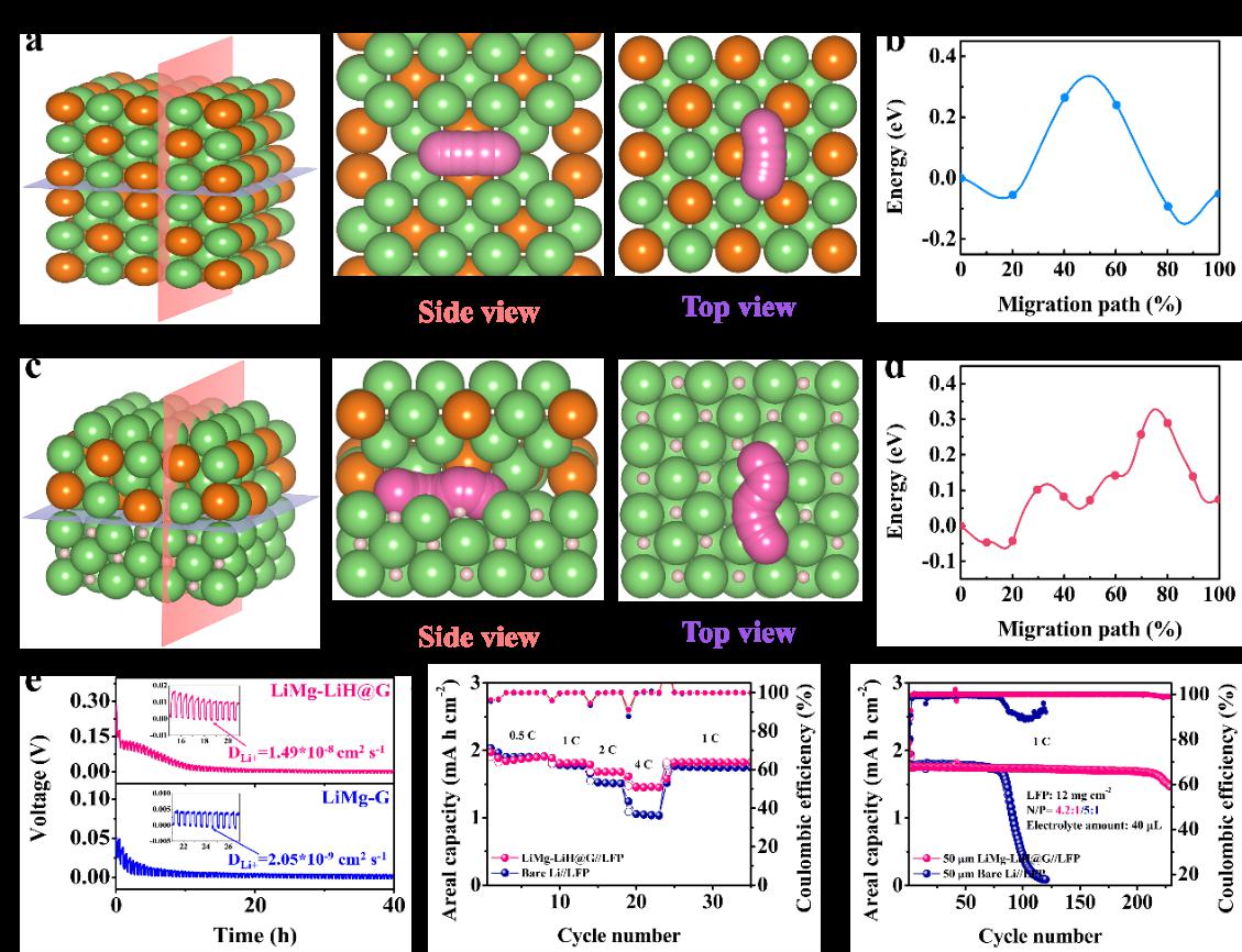研究团队基于多年来在金属氢化物储氢领域的研究基础,首先可控制备出石墨烯支撑的氢化镁(MgH2)纳米颗粒,通过对锂金属和MgH2@G (图1a-c)进行混合辊压以及加热反应处理 (图1d),将石墨烯支撑的氢化锂 (LiH)纳米颗粒均匀分散在LiMg固溶体合金中 (LiMg-LiH@G)。计算和实验结果表明,Li在LiH表面的扩散能垒明显低于LiMg/LiMg界面,有助于实现锂离子的快速传输 (图2a-d)。此外,借助于氢原子的低电负性,LiH/LiMg界面会产生大量的内建电场,可进一步促进Li从LiH表面到LiMg合金内部的快速输运,从而实现快速且均匀稳定的锂沉积。相比于无LiH的对比样品 (LiMg-G),LiMg-LiH@G的锂离子扩散系数提升了近10倍 (图2e-g)。