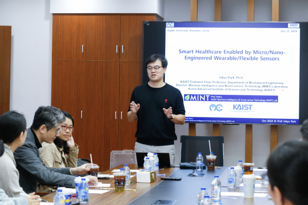 Inkyu Park教授带领机械智能及新型传感器技术团队(MINT)长期从事智能健康监测方面的研究。报告中,他主要介绍了团队在传感器/软体机器人的微纳加工制造技术、可用于环境监测的化学型和可用于人体生理信号监测的物理型先进传感器、以及与人工智能(AI)技术相结合的万物互联新型传感器等三个方向的研究成果。他指出,人口结构老龄化趋势日益显著,通过发展智能健康技术和可穿戴传感器,可以为医疗健康事业提供全新的解决方案,解决医疗卫生问题的经济压力,提升患者生活福祉,增强公民体质。报告结束后,师生们踊跃提问,围绕智能健康监测技术的未来发展和实际应用展开了深入交流,讨论气氛热烈。此次交流不仅增进了学术互动,也为未来的合作和研究提供了丰富的思路和方向。现场气氛轻松愉悦、充满活力,有效地激发了师生的学术热情,拓宽了学术视野,取得显著的成效。