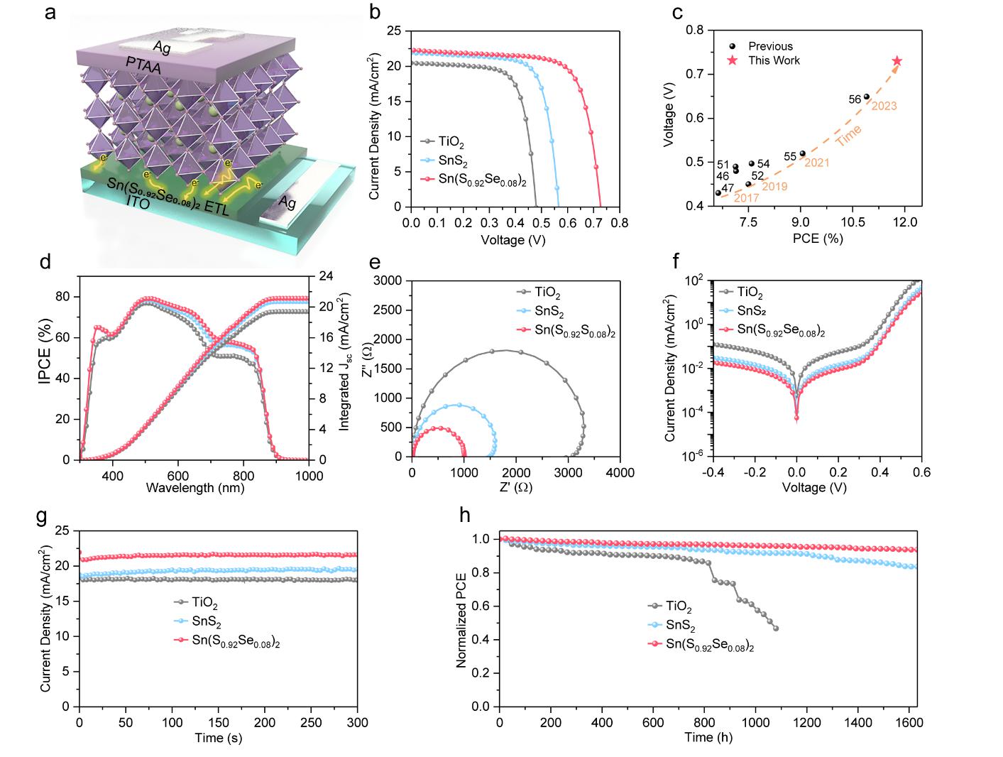 金属氧化物(比如TiO2、SnO2等)长期被视为电子传输层的优选材料。然而,基于金属氧化物电子传输层的正式结构锡基钙钛矿太阳能电池(nip-type TPSCs)的光电转换效率始终处于比较低的水平。近日,腐漫画 梁佳课题组揭示了这一低性能瓶颈的主要原因,认为金属氧化物电子传输层中的氧空位和更深能级是导致效率不高的关键因素。为了解决这些问题,课题组提出了一种新型金属硫族化物电子传输层材料,特别是金属混合硫族化合物Sn(S0.92Se0.08)2,成功改善了这些不足。研究表明,Sn(S0.92Se0.08)2能够有效避免氧分子从氧空位中的解吸,并阻碍Sn2+的氧化;同时Sn(S0.92Se0.08)2展现出较浅的能带结构,进一步提高了TPSCs的光电性能。与传统金属氧化物电子传输层相比,基于Sn(S0.92Se0.08)2的TPSC的开路电压(Voc)从0.48 V提升至0.73 V,光电转换效率(PCE)从6.98%提升至11.78%。此外,这种新型TPSC在稳定性方面也表现优异,在1632小时的测试中,效率仍保持在95%以上。