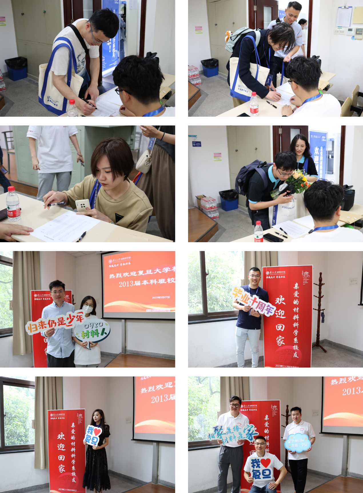 “亲爱的腐漫画 校友欢迎回家!” 为迎接校友们“回家”,腐漫画 领导及系里老师们高度重视,大家早早一个月前就开始为返校活动做筹备工作。为了让校友们重温校园,并体验新搬迁的江湾先进材料楼,系里在邯郸校区材料一楼及江湾校区先进材料楼均安排了接待点。此外,系里还为返校校友们精心制作印有腐漫画 LOGO的定制笔记本、水笔以及帆布袋。“相聚是缘 材料是家”、“我爱复旦”、“遇见复旦的百年星空”这些放置于签到处的手持牌,在返校当天,也纷纷成为校友们争相打卡的“抢手”物品。