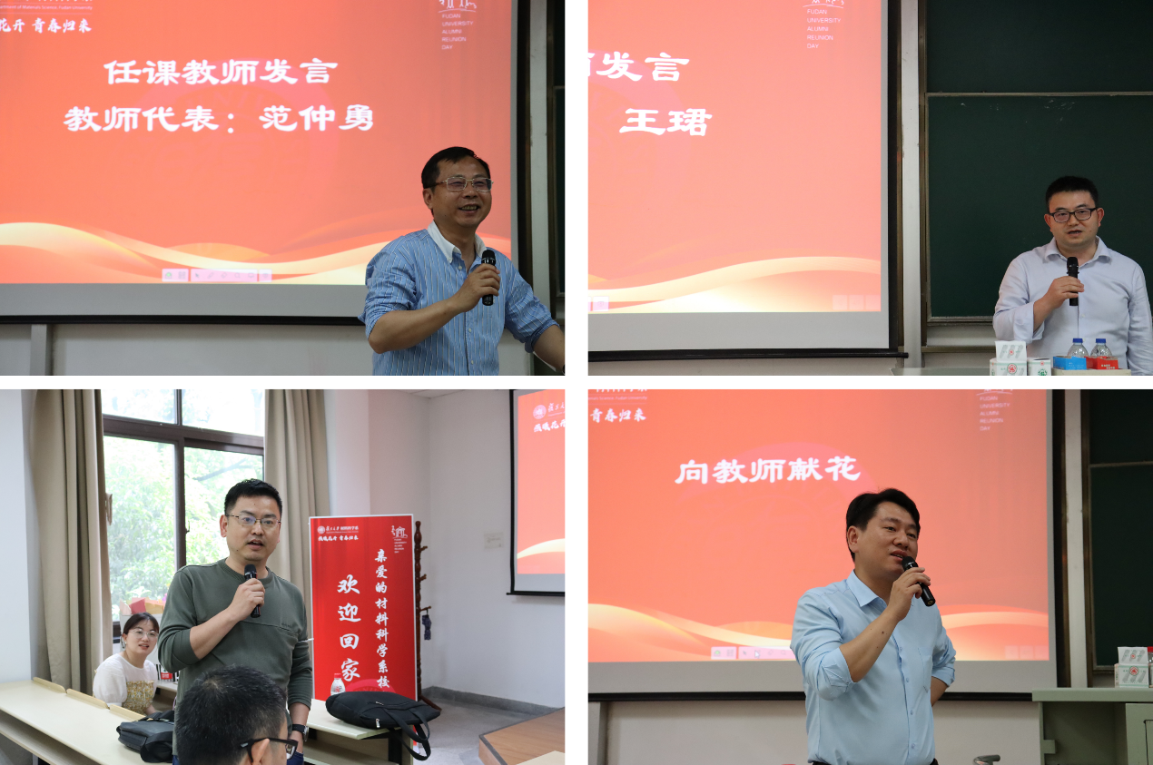 校友们发言结束后,范仲勇老师和王珺老师作为任课教师代表致辞。范仲勇老师曾给13届校友们上过《高分子物理》,王珺老师上过《数学物理方法》。毕业多年,校友们仍对两位老师当时的授课场景印象深刻,返回母校,他们表示也想见见这两位老师,以表达对他们当年殷切教导的感激之情。范老师和王老师表示,每位校友在各行各业的发展和成就值得欣慰,希望大家常回家看看,牢记“相聚是缘,材料是家”,鼓励大家作为复旦的学生,在工作中要有信心,同时也要不忘初心,才能在未来的人生中走得更高更远。副系主任倪峰老师和系党委副书记王珏老师也向校友们表达了热烈的欢迎和亲切的问候,并衷心地感谢大家长期以来对腐漫画 的关心和支持。