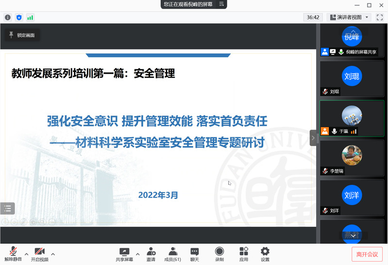 首先,系主任俞燕蕾教授做题为“强化安全意识,提升管理效能,落实首要责任”的专题报告。俞老师从科研团队负责人的角度出发,详尽地介绍了团队在安全意识培养、日常管理措施、药品和仪器管理、废弃物处置、办公环境营造、配合学校监督排查等方面的经验做法。俞老师强调,安全得之于众人之力,失之于一人之手,统筹做好疫情防控和实验室安全管理,深入开展安全教育,帮助学生树立起公众安全健康和社会福祉放在首位的安全理念和价值观。最后她引用习近平总书记的话“发展是第一要务,安全是第一保障”与教师们共勉。