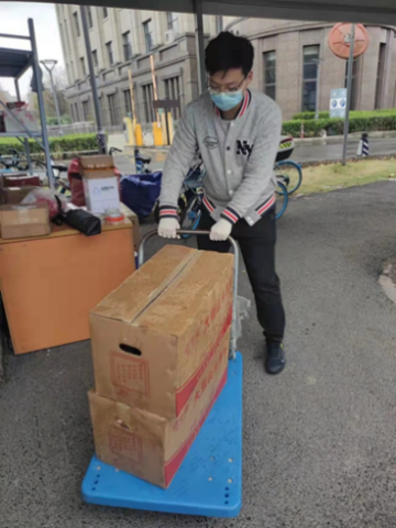 为了使准封闭管理期间学校实验耗材等能够得到保障,保安大哥们需要承担起原本不属于他们职责范围内的消杀和搬运工作。物品之多、之重,也让志愿者们第一次体会到了防疫抗疫一线工作人员的辛苦。志愿者们充分发扬党员的吃苦耐劳精神,积极参与物资的协调、搬运以及整理等相关工作,面对“阴晴不定”的天气和“堆成山”的物资,他们用汗水践行了“我为师生办实事”的诺言。