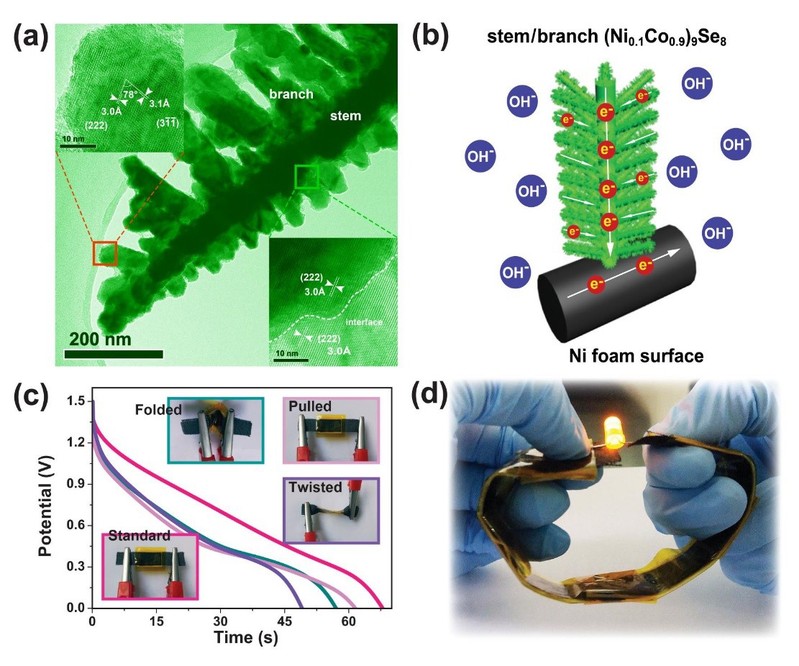 分形是具有以非整数维形式充填空间的形态特征,通常具有最大的暴露表面,如果能够设计出这类结构应用于电化学储能,将可以显著提高“活性物质/电解质”界面处的离子扩散速率和电化学活性位点数量,从而获得高的能量密度。基于以上设想,针对具有高赝电容活性的NiCoSe三元材料,通过溶剂热的设计合成和衬底表面“异向形核、取向聚集”机制,在柔性碳布表面生长出具有分形特征的(NixCo1-x)9Se8树枝状致密纳米阵列。通过Ni元素的可控掺杂与成分优化,获得了5 A g-1倍率下 3762 F g-1 的比电容量,循环5000次之后仍然能够保持树枝状分析形貌和94.8%的电容量。在此基础上,分别利用在碳布上原位生长的(NixCo1-x)9Se8树枝状致密纳米阵列为正极、石墨烯为负极,组装了非对称的全固态超级电容器,窗口电压为1.5 V, 分别获得了高达17.0 Wh kg-1 的能量密度和3.1 kW kg-1的功率密度,达到了这类NiCoSe三元材料的目前最佳性能。为了展示潜在应用性,将串联后的固态电容器制成手环型的柔性器件并成功为LED充电。手环型超级电容器可以戴在手腕上,即便拉伸、扭转和折叠,也不会对于储能性能有影响和对身体造成伤害。