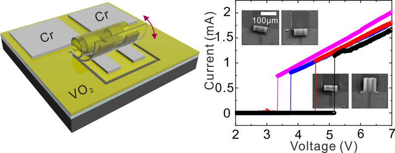 二氧化钒是一种强关联材料,在温度约为68℃时,其晶体结构发生金属-绝缘体相变,并伴随有电阻、能带、光学吸收等材料性质突变。梅永丰教授课题组利用纳米薄膜自卷曲技术,制备出新型的微型双压电薄膜晶片结构。结合应变工程调控VO2纳米薄膜材料内应力,从而实现了材料相变温度在53℃-68℃区间可调,并且成功制备出工作温度可控的微型片上温度驱动器件。本研究为开发新型温度自反馈执行器件提供新思路。该工作得到美国伊利诺伊大学芝加哥分校的Zheng Yang教授的大力支持。文章发表在Nano Letters (2018, 18, 3017)。