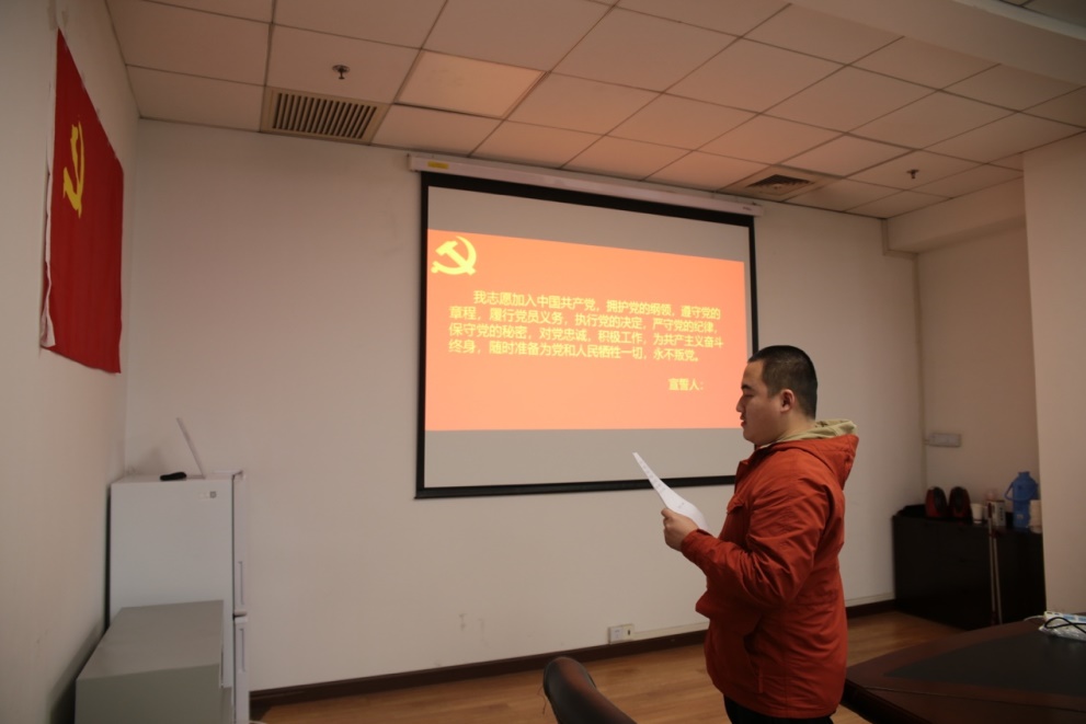 在奏唱国歌后,全体新党员面向党旗,举起右手,跟随领誓人2016级硕士生吴刚同志庄严宣誓。