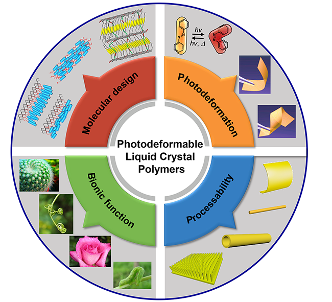 模仿生物的刺激响应行为(如动物的趋光性、植物的向湿性等)构筑智能材料是新型功能材料发展的重要方向之一,有望应用于生命医疗、航空航天、军事探测等多种领域。液晶弹性体兼具优异的协同作用和高分子网络的弹性,能够在外场(热、电、磁、光等)刺激下,通过改变液晶基元的排列而产生各向异性的形状(尺寸)变化。与众多刺激方式相比,光驱动方式由于其可控性好、可远程定点操作、对使用环境无要求而受到广泛关注。光响应液晶高分子通常含有能吸收光能的分子或官能团,其在光的作用下会发生某些物理或化学反应,产生一系列结构和形状变化,从而表现出特定的功能。偶氮苯类衍生物是目前研究最为广泛的一种光响应基团,它可以在光的作用下实现顺反异构化的转变。光化学反应引起的分子结构变化可以在液晶基元协同效应的作用下进一步放大为材料的宏观形变。