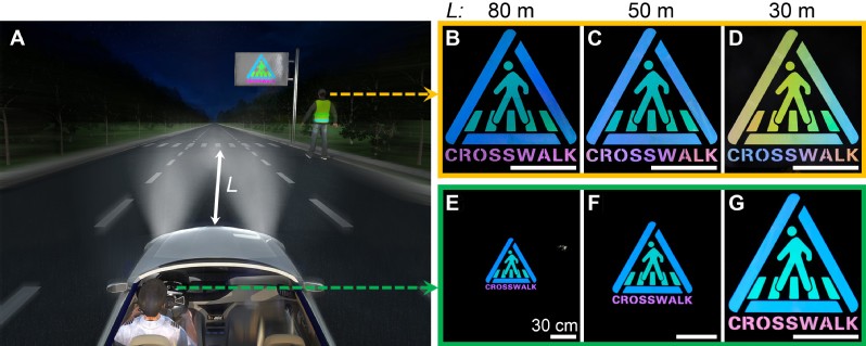 图2.(A)逆反射结构色薄膜制备的交通反光标牌在夜间道路上应用的示意图,以及车辆距离标牌不同距离L时(80米、50米、30米)(B-D)行人视角和(E-G)司机视角的照片