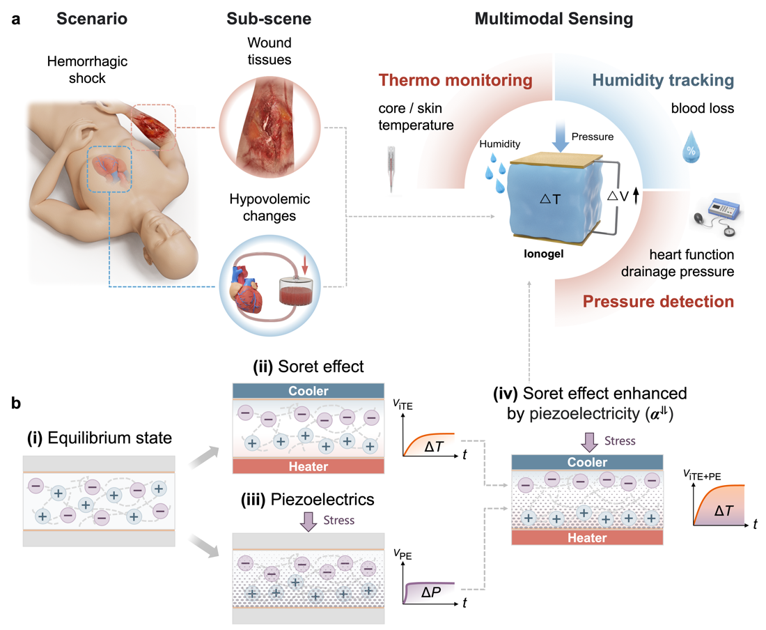 论文聚焦于一种由经典PVDF-HFP和离子液体[EMIM][TFSI]组成的离子凝胶。尽管该材料已广泛应用于离子热电、压电、储能和功能涂层等领域,但过去的研究仅限于单一功能的探索,未曾深入研究其多功能协同利用的可能性。受离子热电特殊电容特性的启发,该论文首次探讨了材料压电和离子热电性能的叠加作用,提出并验证了"压电增强离子热电"的创新概念。基于这种对双参数高度敏感的特性,研究团队成功开发了一种嵌入式、自供电、多模态感知的凝胶传感器可应用于多个场景,分别搭载于动脉导管和医用负压吸引海绵中,实现了临床诊疗中对温度、压力和湿度的同步精确检测。