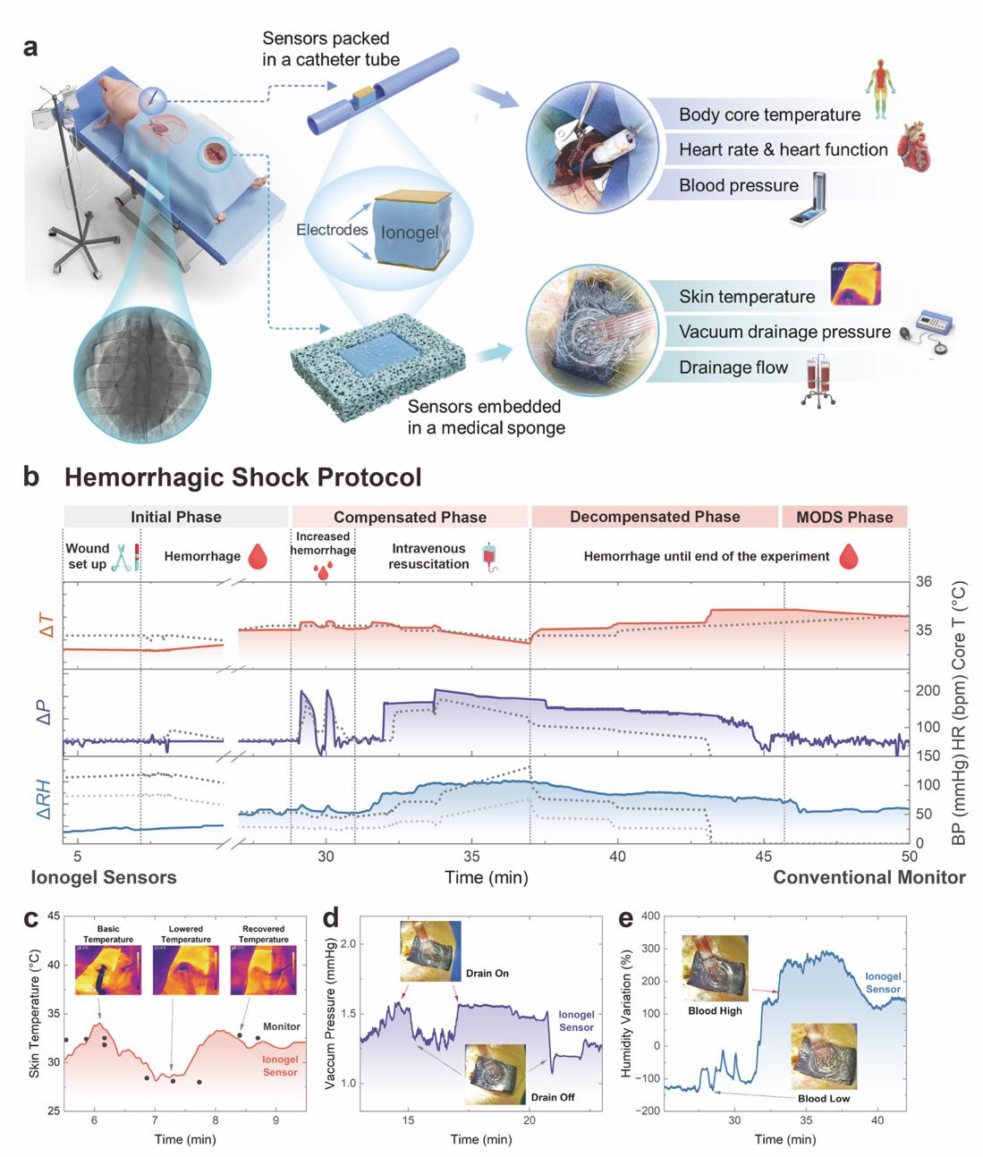 基于材料的温度–压力双参数灵敏特性,团队设计了两种分别以动脉导管和医用海绵为载体的离子凝胶传感器。器件结构简单:将离子凝胶夹在两片电极之间并连接导线,嵌入动脉导管或医用海绵的开孔,再用硅胶填充缝隙。通过建立猪出血性休克模型,全面验证了离子凝胶传感器在实际生物体疾病发生过程中的多指标监测可行性。其中动脉导管传感器的温度和压力信号能准确反映休克过程中的核心体温变化和心率波动;海绵传感器则捕捉创口温度、负压吸引装置(VSD)的压力以及瞬时引流量等关键指标。与传统传感器相比,离子凝胶传感器不仅趋势一致,且由于信号点更为密集,能呈现更多细节变化。这些成果展示了该技术在临床领域的巨大潜力,尤其适用于当前缺乏相关精密压力、湿度、温度监测手段如VSD应用中,具有非常重要的临床价值与传感器应用的划时代的意义。