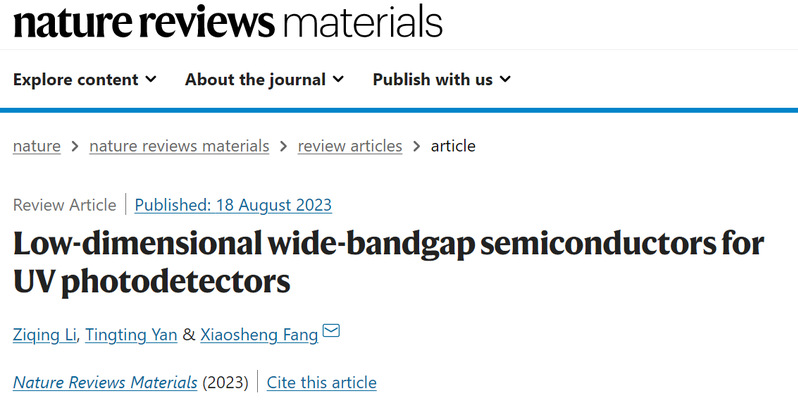 近日,腐漫画 方晓生课题组在国际学术期刊Nature Reviews Materials上发表题为《Low-dimensional wide-bandgap semiconductors for UV photodetectors》的综述论文。光电研究院青年教师李自清和腐漫画 博士研究生严婷婷是论文共同第一作者,方晓生教授是通讯作者。低维宽禁带半导体的紫外光探测器在成像、通讯、多光谱探测、弱光探测、可穿戴电子等领域表现出广阔的应用前景。本论文聚焦于低维宽禁带半导体光电探测器领域的进展、挑战和展望,讨论了宽禁带半导体如何在材料设计、维度工程、器件工程等方面调控形貌结构和光电性能,并阐释了材料生长、器件结构和应用场景的内在联系。