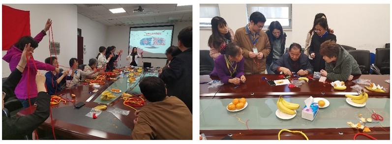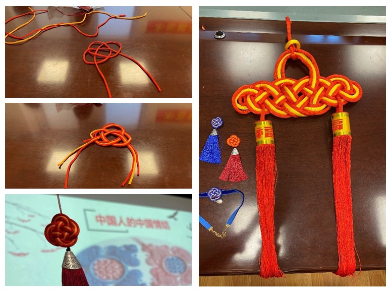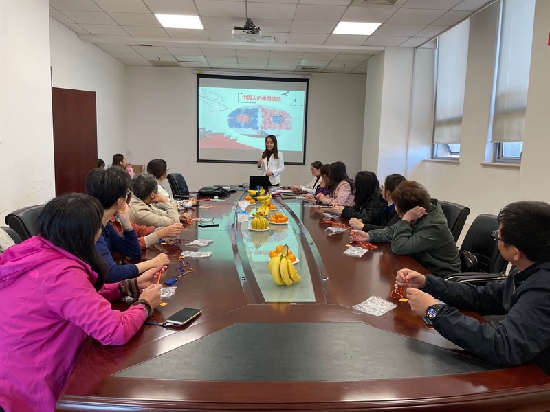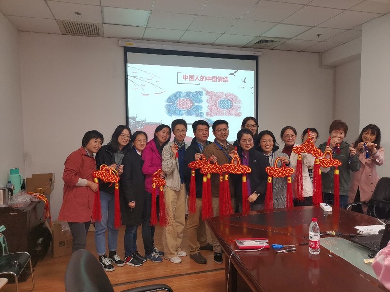 活动伊始,专业老师向大家介绍了中国结的来源。围绕着中国人的中国情结,从最初的结绳记事功能到现在的美观装饰功能。不同的结绳方式都承载了大家对美好生活的向往。盘长结的长长久久和长寿,团锦结的花团紧簇,同心结的百年好合,双钱结的财源滚滚。这些赋予小小绳结的美好寓意,体现了传统文化的博大精深。老师通过趣味问答的方式帮助大家拓展对中国结的了解,调动老师们参与手工编织中国结的热情,做好了热身工作。