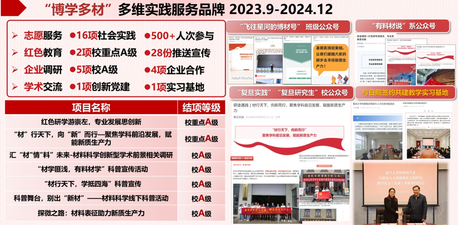 支部以党建为核心,强化理论学习,从“听-学-演-创”四个方面构建特色理论学习的文化,在学习中实现铸魂育人。支部与化学、信息、计算机、瑞金医院等开展校内外跨专业、跨学科的合作共建,积极借助社会大课堂让支部工作活起来、实起来、强起来。组织参加追寻红色足迹的实践活动14次,牢记历史使命;在校内外参与志愿服务活动,累计服务200余人次;先后赴30余家企业进行专业调研,覆盖了半导体、新能源等行业,形成8份调研报告;结合专业特点,建立了“博学多材”实践品牌,目前共申请了16项社会实践项目,其中校重点A级2项、A级5项,并与山东日照签约共建实习基地。过去一年多时间,支部成员足迹遍布12个省、18个市,积极投身社会实践,展现了新时代青年党员的担当。