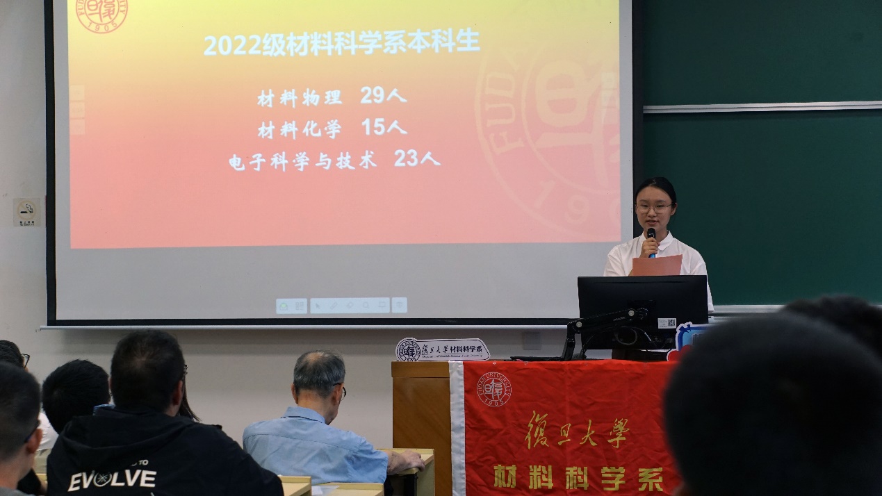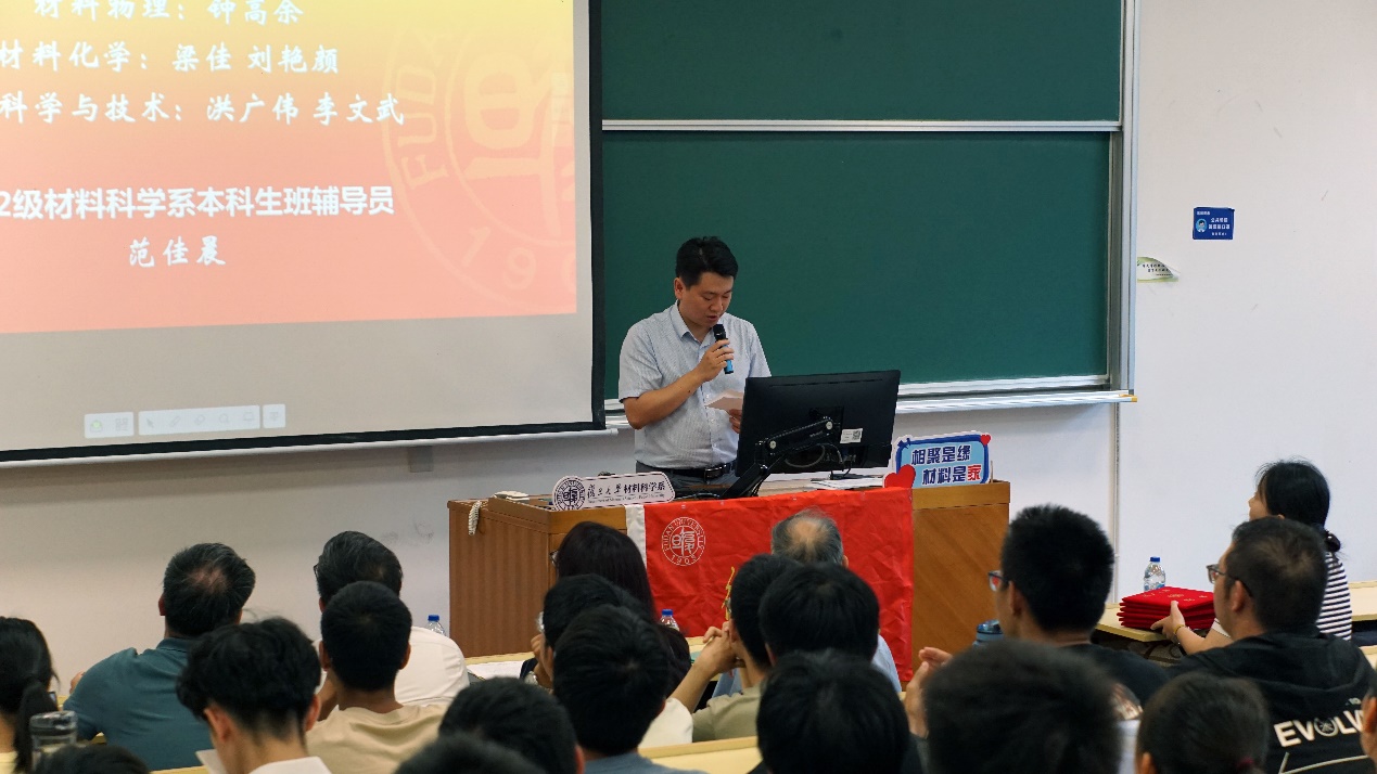 最后,系党委书记于瀛老师以“热爱”为关键词,向同学们精心讲授了第一堂思政课。于老师从“国家-专业-生活”三个层面出发,阐释了复旦材料人的理念与追求。于老师提到,第一,要热爱国家,做有担当的材料人。一代人有一代人的使命,如今国家仍有许多“卡脖子”难题,需要我们材料人接过前辈的接力棒,走好我们这一代的长征路。第二,要热爱专业,做懂专业的材料人。专业是我们探索未知,认识世界,服务社会的窗口。复旦的材料学子活跃在华为、中兴国际、比亚迪、中国火箭运载研究院等重点单位里,彰显了复旦材料人的爱国敬业品质与扎实的专业功底。第三,热爱生活,做有趣的材料人。在学习工作之余,同学们还应该拥有一个有趣的灵魂。不仅在材料专业的舞台上,在广泛的社会舞台上都能绽放自己的光芒!