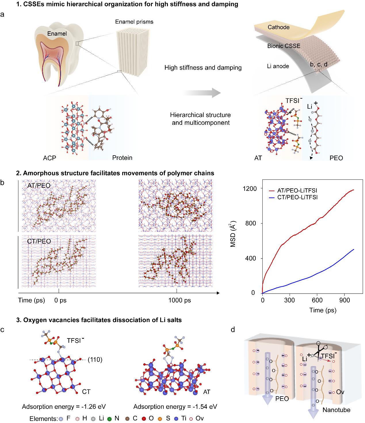 近日,腐漫画 赵婕课题组和化学系李伟课题组在Angewandte Chemie期刊上合作发表了题为“Multiscale Engineered Bionic Solid-State Electrolytes Breaking the Stiffness-Damping Trade-Off”的研究论文。研究团队受牙釉质超结构的启发,设计并开发出一种由非晶TiO2纳米管阵列与聚合物电解质PEO交织而成的仿生复合固态电解质,实现了高刚度(杨氏模量达15 GPa,硬度为0.13 GPa)和优异的阻尼性能(tanδ=0.08),成功解决了传统固态电解质中刚度与阻尼难以兼顾的问题。一方面,这种电解质拥有媲美无机固态电解质的刚度,可有效抑制锂枝晶的生长;另一方面,其阻尼性能接近于聚合物固态电解质,确保了与电极的紧密接触。