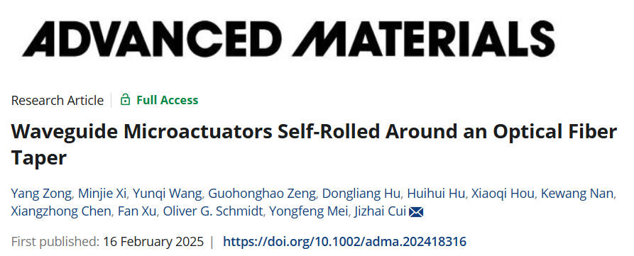 Yang Zong, Minjie Xi, Yunqi Wang, Guohonghao Zeng, Dongliang Hu, Huihui Hu, Xiaoqi Hou, Kewang Nan, Xiangzhong Chen, Fan Xu, Oliver G. Schmidt, Yongfeng Mei, Jizhai Cui*, Waveguide Microactuators Self-Rolled Around an Optical Fiber Taper, Advanced Materials, 2025, 2418316.